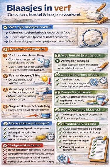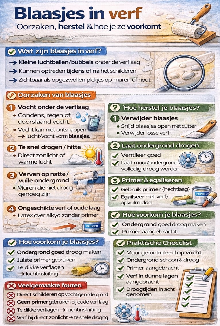 Blaasjes in verf ontstaan meestal door vocht, te dikke lagen of te snelle droging. Gelukkig zijn ze goed te herstellen als je de oorzaak aanpakt.
