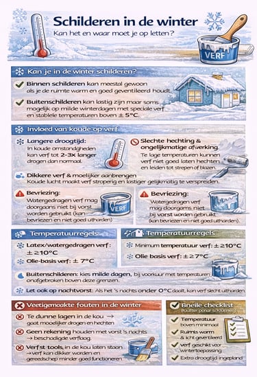 Schilderen in de winter is zeker mogelijk, vooral binnen, zolang je rekening houdt met temperatuur, ventilatie en droogtijd. Door slim te werken voorkom je de meeste problemen.