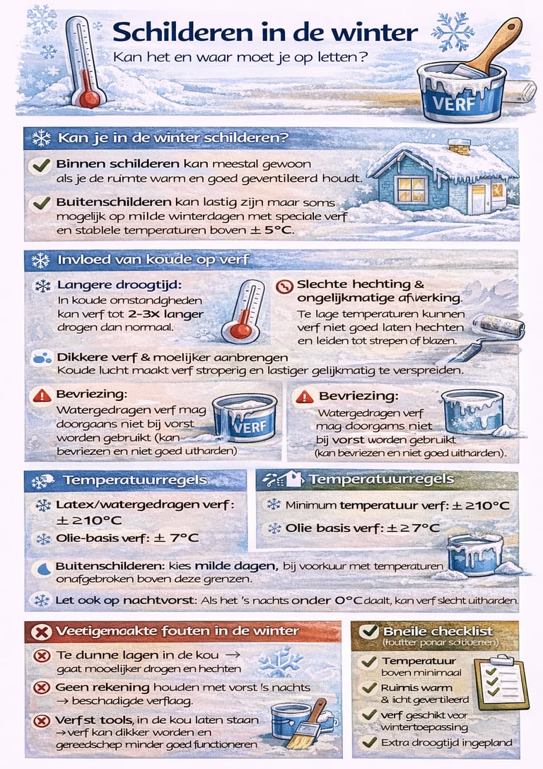 Het korte antwoord: ja, schilderen in de winter kan, maar alleen als je rekening houdt met een aantal belangrijke factoren. In dit artikel leg ik uit wanneer winter schilderen verantwoord is, waar het vaak misgaat en hoe je problemen voorkomt.