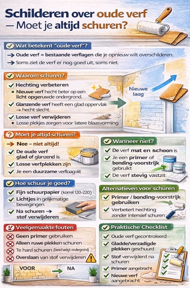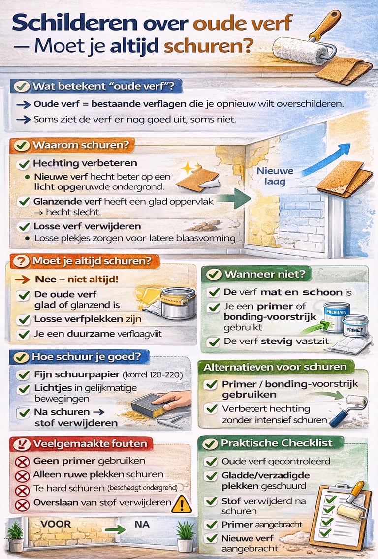 Of je moet schuren hangt af van de staat van de oude verf, het type verf en de ondergrond. In dit artikel leg ik uit wanneer schuren noodzakelijk is en wanneer je direct kunt overschilderen.
