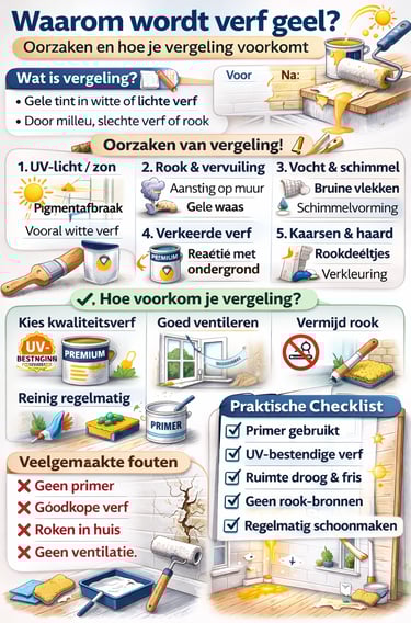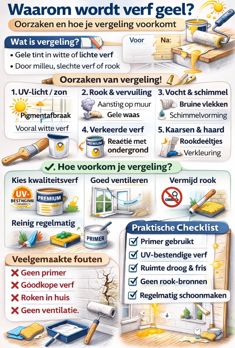 Verf geel laten worden is vaak te voorkomen met de juiste verf, goede voorbereiding en aandacht voor vocht en zonlicht.